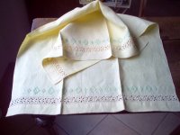 Asciugamani in lino giallo con sfilatura e ricamo verde.