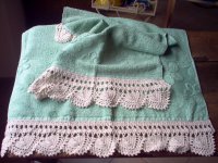 Coppia asciugamani in spugna verde con merletto crochet ecru.